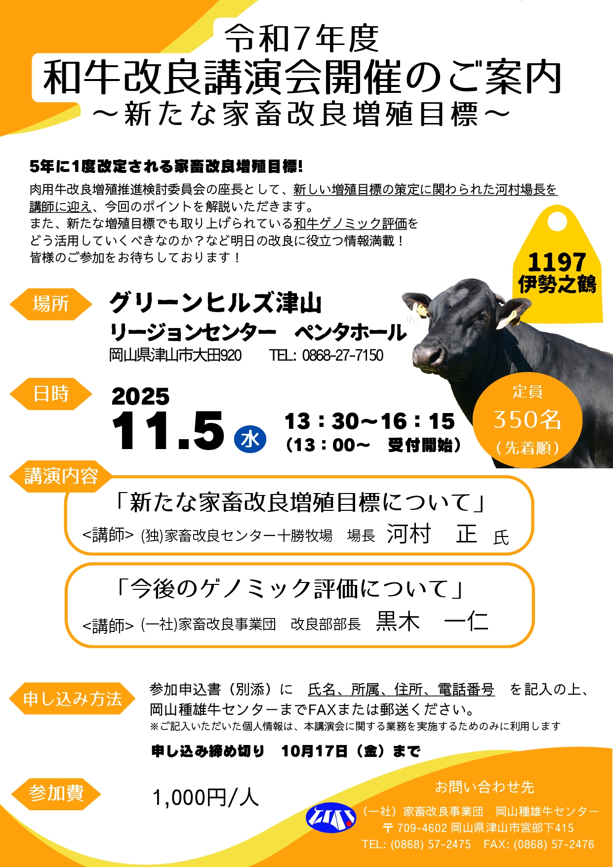 今年も岡山種雄牛センター主催の和牛改良講演会を開催いたします。