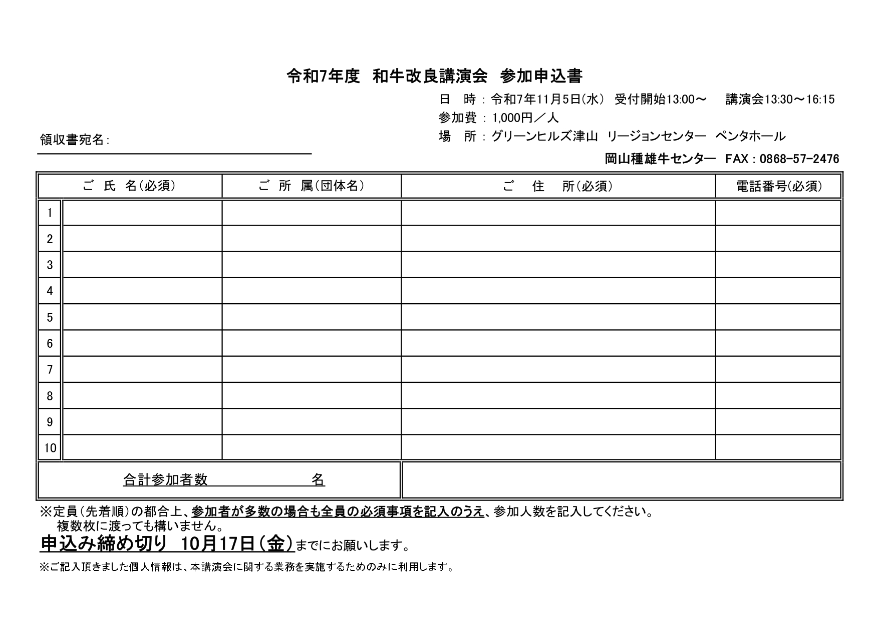 - 申込方法:申込用紙を記入のうえ、10月17日(金)までに岡山種雄牛センター宛てにFAXまたは郵送でお送りください。