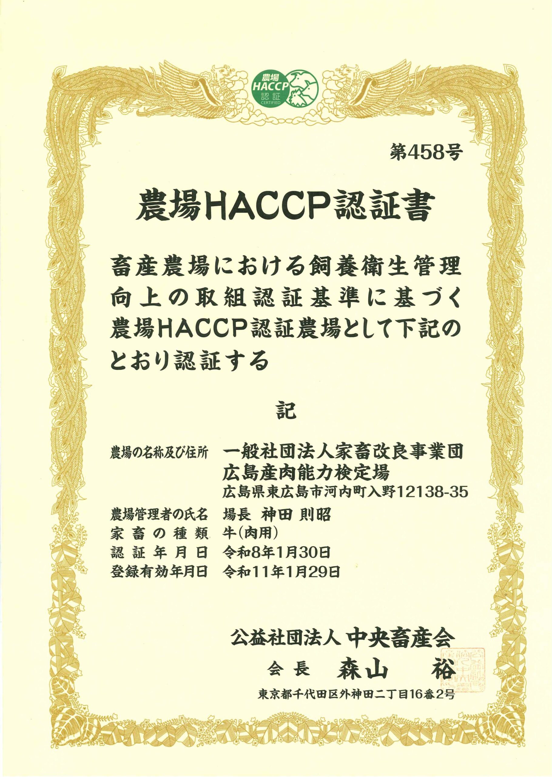 令和8年1月30日付で、当団の広島産肉能力検定場が「農場HACCP認証」を取得いたしました。